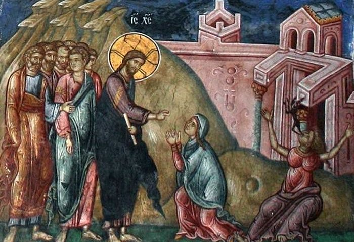 И изишавши оданде Исус отиде у крајеве тирске и сидонске. И гле, жена Хананејка изиђе из оних крајева и повика му говорећи: Помилуј ме, Господе, сине Давидов, кћер моју много мучи ђаво! А он јој не одговори ни ријечи. И приступивши ученици његови мољаху га говорећи: Отпусти је, јер виче за нама. А он одговарајући рече: Ја сам послан само изгубљеним овцама дома Израиљева. А она приступивши поклони му се говорећи: Господе, помози ми! А он одговарајући рече: Није добро узети хљеб од дјеце и бацити псима. А она рече: Да, Господе! али и пси једу од мрва што падају са трпезе господара њихових. Тада одговори Исус и рече јој: О жено, велика је вјера твоја; нека ти буде како хоћеш! И оздрави кћи њена од онога часа (Мт 15, 21–28).
