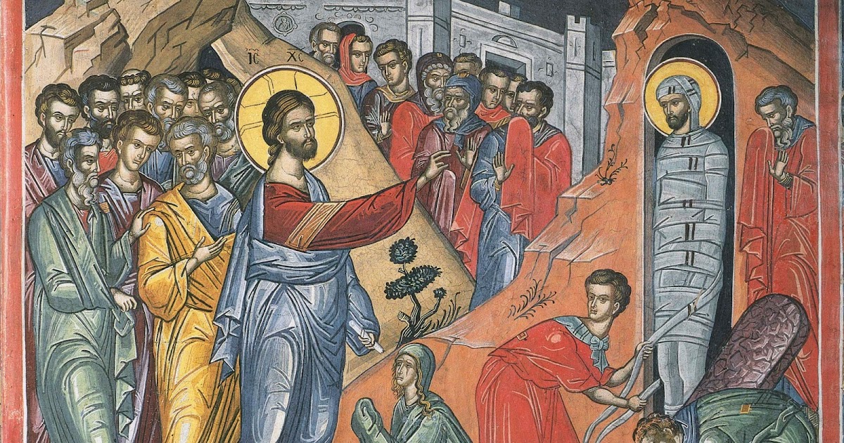 Након што је камен склоњен, пред Христом је било мртво тело које се распада и заудара. Христос позива Лазара из гроба и враћа га у живот. Живот без Бога је трулеж и распадање. Христос је дошао да нас позове у нови живот, да нас приведе из небића у биће (анафора евхаристијског канона). Христос се обраћа Оцу: „Оче, благодарим Ти што си Ме услишио! А Ја знадох да Ме свагда слушаш“. Свети Григорије Палама о овоме каже: „Подигао је пред свима очи своје ка Оцу, и обратио му се тим речима, како би они схватили да је Он, који говори на земљи, једнак Највишем Оцу, који је на небесима. Саветовање је претходило како на почетку стварања које је требало да приведе човека у биће, тако и сада – приликом пресаздања човека у лику Лазара. Тада је, намеравајући да створи човека, Отац рекао Сину: ‘Да начинимо човека’, и Син је послушао, па је тако човек дошао у живот. Овде, пак, сада, када је Син говорио, Отац Га је послушао, и тако је Лазар оживео.“