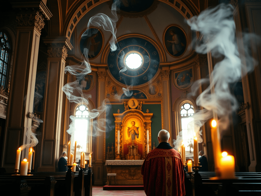 Свештеник кади олтар, иконе, народ и свети простор као чин очишћења и припреме за заједницу са Богом. Дим тамјана у том контексту није само симбол већ и дело – он „одгони“ све што је нечисто, како духовно, тако и телесно.